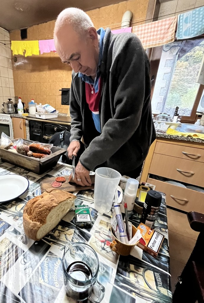but in the very first village we were stopped by Nano “El Feo”. He welcomed us as pilgrims with a rich offer of salami, prosciutto, cheeses and wine. One of the angels of the Camino!