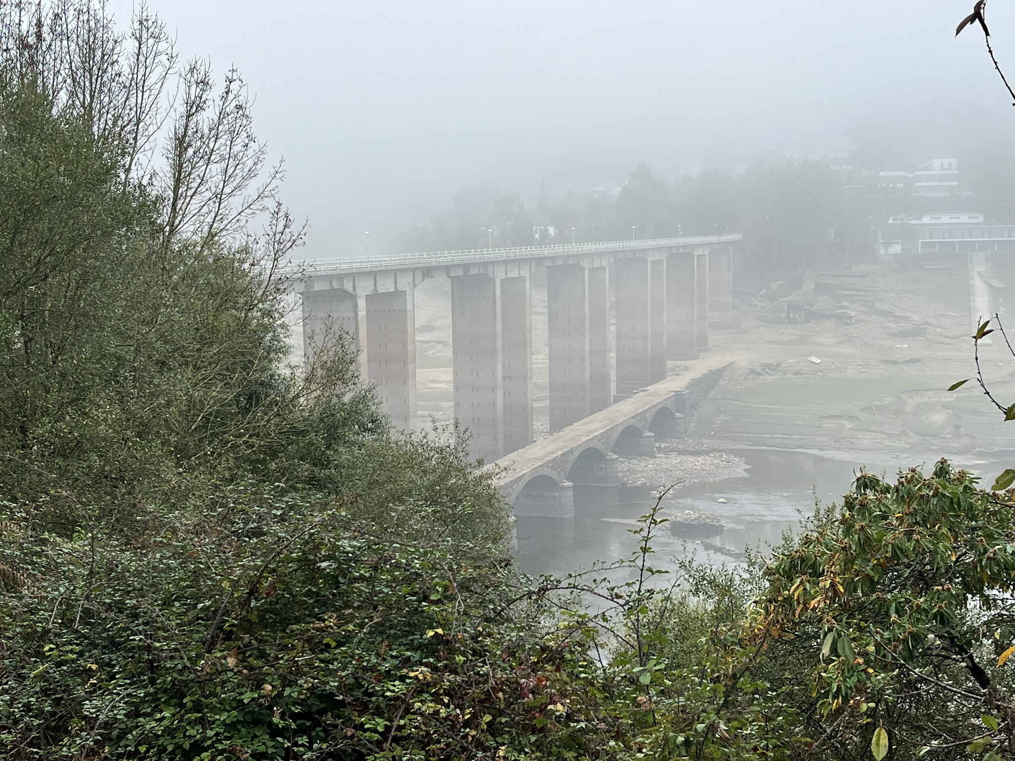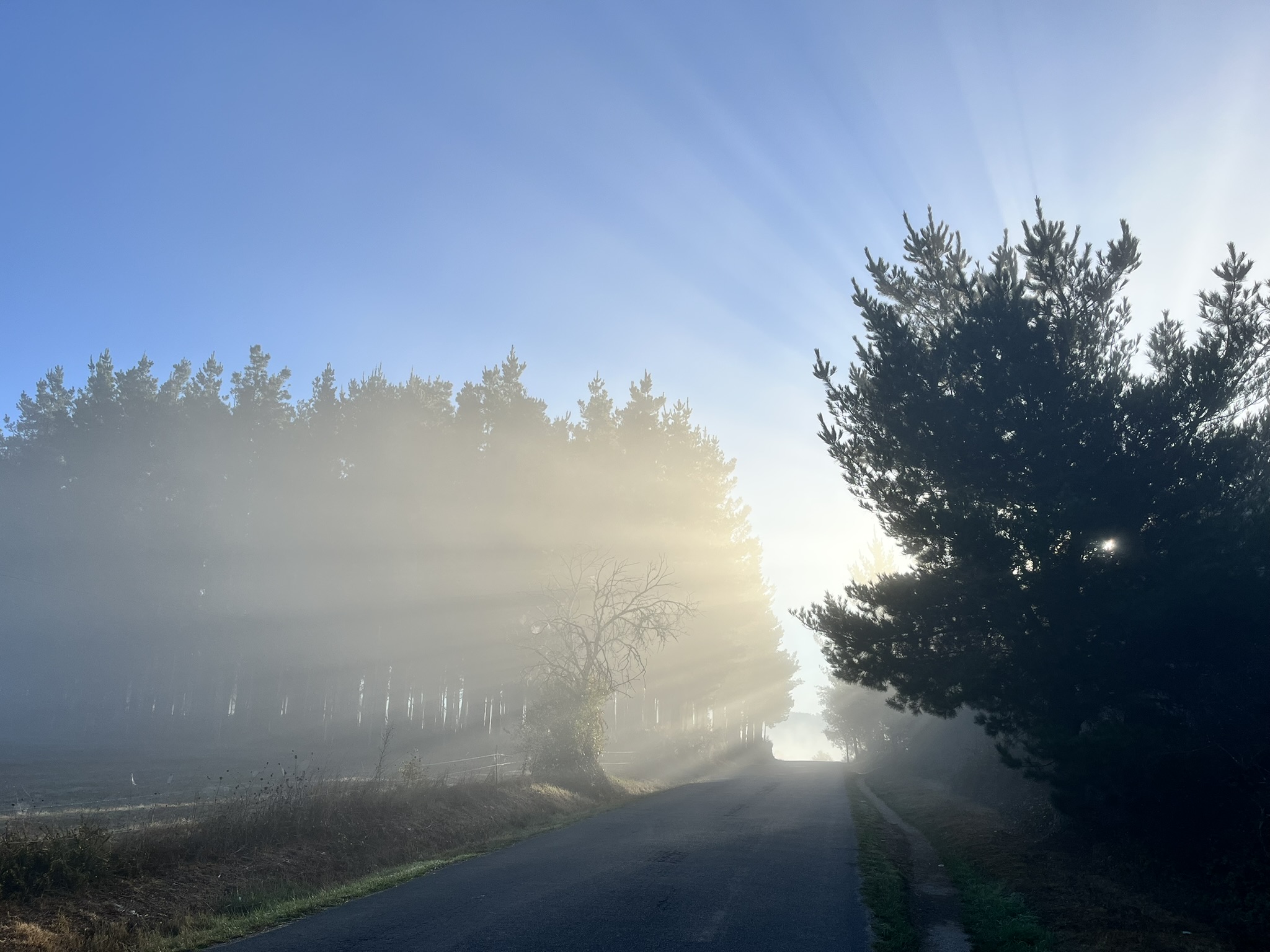 As we begin to descend towards Portomarin, we enter more and more into the fog, which becomes thicker, but still plays with the sun’s rays that try to break through it.