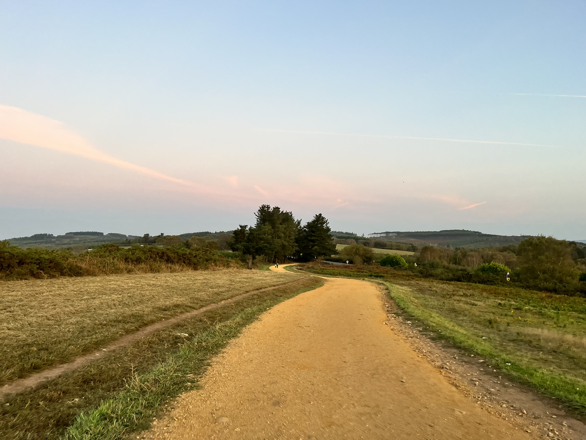 Climbing with the sunrise behind a slightly cloudy eastern horizon. Still a nice and sunny day and a long walk.