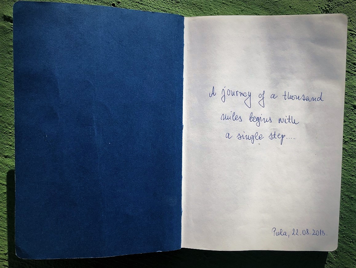 Before departing to this Camino, I decided to take with me a handy notebook and while on Camino to write my short diary. I suspected that, while on Camino, walking all those distances, I will not have time or suitable conditions for writing a proper, “full” diary. Still, it would be good to note some observations, thoughs and feelings while livning that Camino experience, little “asterisks”. That notebook had to be solid, easy to take out and put back in the backpack. Not too big, not too small. I spent few days in looking for it in few stationary stores but was not satisfied with any offered. Finally, on twenty second of August my colleague Barbara gave me a suitable one, with a hand written dedication: „A journey of a thousand miles begins with a single step…“. Was starting single step the one when I step out my home on that morning, Saturday thirty first of August or the one before dawn in Seville on second of September? Irrelevant. Thanks Barbara.